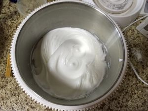 三只蛋清分三次加入细砂糖打发至干性发泡。