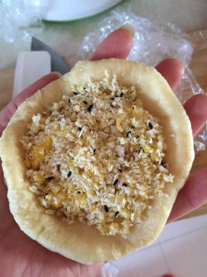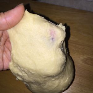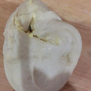 面团擀成面饼,里面包裹椰蓉馅