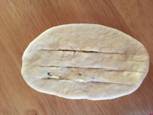 把包好的椰蓉包子再次擀成扁片,长条形状,上面顺向划开三刀