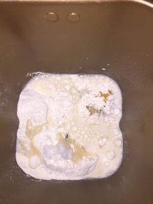 把除了黄油之外的面团材料加入面包机进行和面