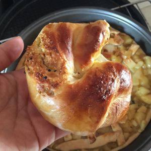 如拧麻花一样拧成圆形,首尾相接捏牢固,放入烤箱二次发酵,至两倍大!表面刷蛋液,再次放入烤箱
