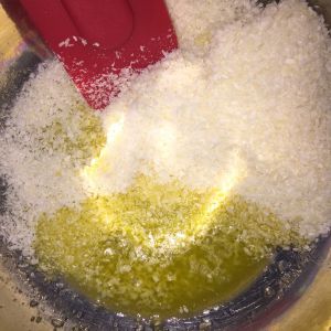 准备椰蓉馅料,黄油隔水融化,加入椰蓉