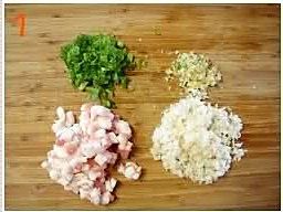 肥肉切筷子头大小、瘦肉切小块后剁成肉碎、马蹄切末、葱花、姜末、蒜末备齐;