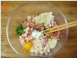 肥肉丁、瘦肉泥、马蹄末、葱花、姜末、蒜末、蟹肉放入大碗,加入一个鸡蛋适量蚝油、水、生抽、盐、糖、料酒、淀粉,朝一个方向搅拌上劲,成为肉馅;