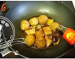 放入肉球翻炒,乘热喷入适量料酒,加入适量蚝油、生抽、老抽炒匀;