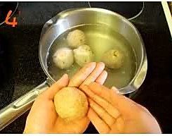 锅里加入适量水,当水温微热不烫手的时候,取适量肉馅在手中左右摔打、团成较大的肉球,然后将团好的肉球放入温水里小火加热,使之慢慢成型、变色后捞出;