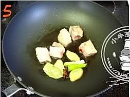 另取一只锅,加入少量油,将汆烫洗净的排骨、八角、冰糖、葱段、大蒜,小火炒香,排骨煎黄;