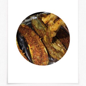 茄子切好入上下火220度预热3分钟的烤箱,表面刷上一层油,烤15至20分钟,5分钟刷一次油,15分钟后用筷子戳,一戳到底便算熟了