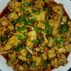 放入熟肉末,豆腐,蒜苗段,小火煮1~2分钟,水淀粉勾芡加入几滴香油和适量红油搅拌均匀。