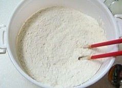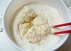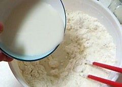 将牛奶酵母混合液体慢慢倒入面粉中,边倒边用筷子搅拌。