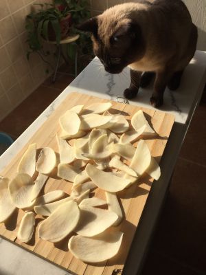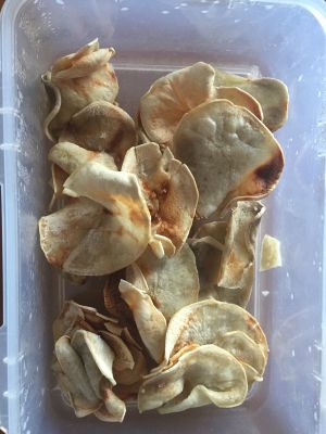 晒干的土豆片放在大一点的微波炉饭盒里,撒一点橄榄油和细盐拌匀。