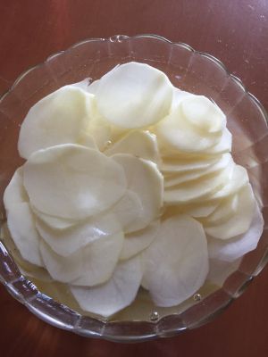 土豆去皮切薄片清洗几次后在清水里泡10分钟,这一步是为了去掉土豆里的淀粉。