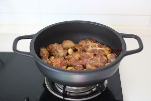 将锅内的大蒜捡出(大蒜在长时间炖煮后会变得软烂,卖相不好),煎好的牛尾用筷子移至汤锅中(锅底的余油有其他用处,不要和牛尾一起倒进汤锅),加红酒(这次我不小心红酒放多了,预估200ml就足够了)和热水没过牛尾,大火煮开后转小火,用勺子撇去浮沫。