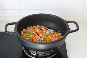 利用煎牛尾的余油将胡萝卜、洋葱和西芹丁炒软,关火。