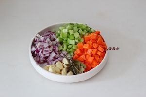 胡萝卜、洋葱、西芹处理干净后切指甲盖大小的丁,大蒜、香叶、干的迷迭香(没买到百里香用了干迷迭香,没有也可不放)备好待用。