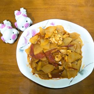 翻炒一会,加入一勺甜面酱,继续翻炒。
