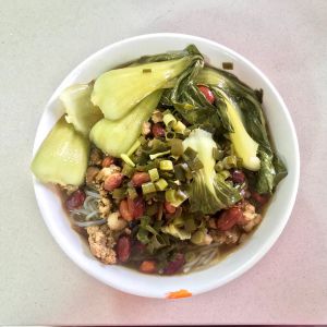 肉切沫,姜切沫,葱切葱花,香菜切小段,青菜洗净