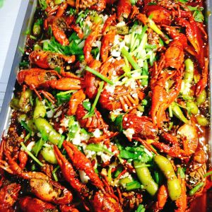 两斤小龙虾,我是用的一两干辣椒切段,一两花椒,按照自己口味按量放,八角两个,三奈两个,香叶三片,桂皮一块,肉蔻一个,啤酒一瓶,白酒一点点,白糖适量,生抽老抽适量,一个火锅底料[憨笑][憨笑]小葱香菜切段,两个大蒜切沫,我尝试了小龙虾里烧毛豆,哇塞,味道真的超赞,建议你加毛豆,真的超级入味儿,毛豆两端剪一点,方便入味,锅里放适量的油,多一点点[憨笑]油热后,小火放火锅调料,炒化后,放前边准备的香料,这里先不要放蒜末,炒好后,放入小龙虾,翻炒变色,之后加入啤酒,适量的白酒,还有清水,淹没过小龙虾,大火烧开后,放入适量的盐,老抽生抽,白糖,鸡精,转小火慢慢煮至水少后放入毛豆翻炒均匀,待毛豆熟透后,加入准备好的蒜末,蒜末不要全放了留一点,翻炒均匀,然后装盘,撒上小葱香菜和剩余的蒜末就OK了[憨笑]