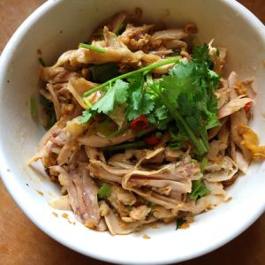 鸡剔除骨头,鸡肉撕成条,加入生抽、蒜泥,小米椒,姜末,少许醋,花椒油,拌匀最后撒一点香菜,点缀增香就完成了。