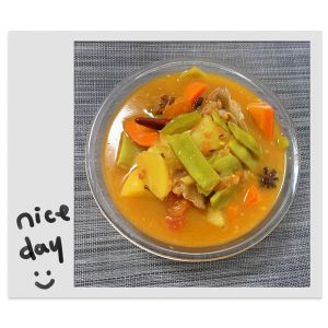 接下来 准备配菜。自己可以随便准备啊。我切了土豆。胡萝卜。豆角。西红柿。青椒。还有些 鲜蘑(我个人觉得 鲜蘑很好吃)