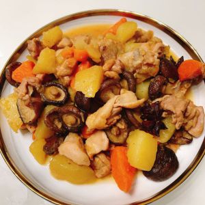 所有原材料随意切块。我用的是干香菇,所以温水泡发,如果用鲜蘑菇就洗净备用。
