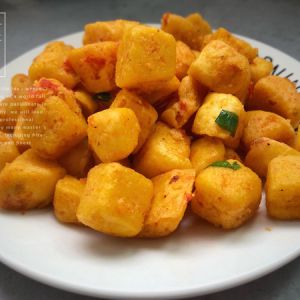 翻炒至馒头丁变成金黄色,出锅备用