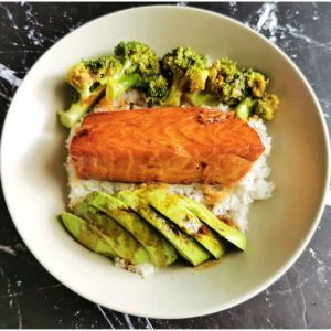 先把西兰花烫熟,牛油果切片,装一碗米饭,摆上三文鱼和蔬果即可。
