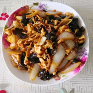 木耳,黄花菜,葱头,鸡蛋入锅翻炒,出锅前加耗油,最后勾芡。
