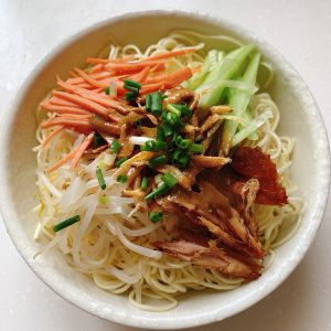 黄瓜、火腿肠切丝 烤鸡肉蒸热手撕 生姜、大蒜头切碎泡水 小葱切碎