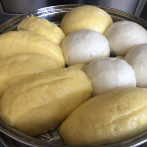黄色的是胡萝卜汁馒头,面发好后,排气(就是把面团揉至光滑,)然后一块块切好,醒15分钟左右