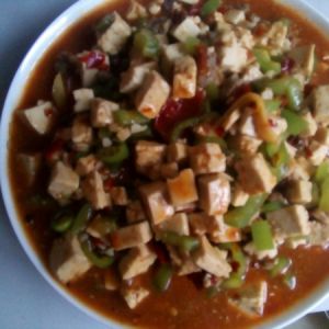 油热,下肉,豆瓣酱,炒出红油下姜蒜!放入豆腐,杭椒,老抽翻炒,加开水没入!加水淀粉,盐出锅!