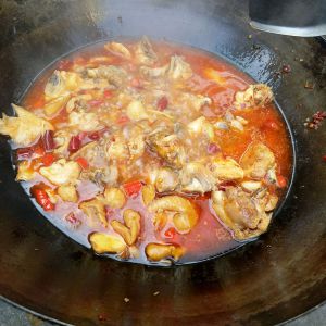 热锅下油,待油10成热放入洗干净的鸡肉,大火煎一会,加入生姜,料酒,待鸡肉煎至金黄色,下小尖椒,干辣椒大蒜翻炒一会加入一勺豆瓣酱,炒香后加入开水。