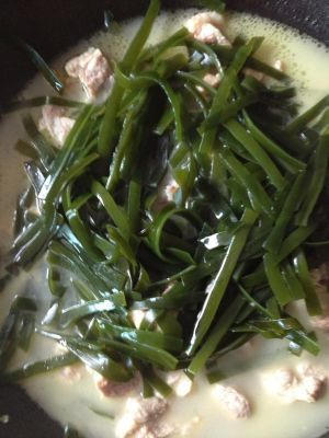 最后起锅前,放入香菜,葱段,鸡精,上桌