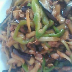 热锅到油,冒白烟时放一勺豆瓣酱,再将盘中的姜,蒜,花椒,大葱,肉丁放入翻炒至出香味,再把茄子,青椒放入翻炒至青椒变软加入味精翻炒几下即可出锅。