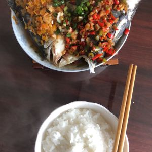 将腌制好鱼头放入盘中均匀将剁椒放在鱼头