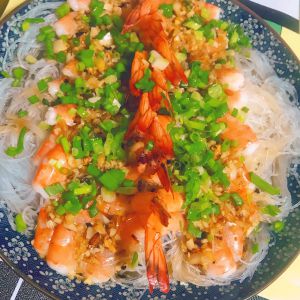 把腌好的虾用清水冲洗干净,粉丝铺底虾摆盘备用