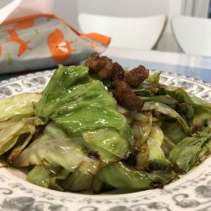 5、加入包菜,大火翻炒。加少许盐、鸡精翻炒均匀。
