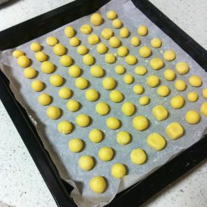 可以开始撮小球啦,记得小块小块操作,每取一小块,剩下的还是用保鲜袋包好,这个面团水分少,特别容易干,最后操作的部分就不是很好成形