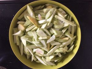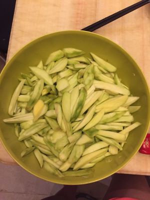 2.将青芒果去皮,去核,切成条。注意千万不要用自来水去洗,保持干燥,否则容易坏。一般这个过程都很干净,也不需要洗。