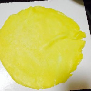 1:低筋面粉加入牛奶中搅拌均匀,蛋黄加入35克糖粉搅拌好,黄油搁热水软化至液体,一起倒入牛奶糊中过筛,平底锅烧热小火不放油,迅速转动成型,依次做好全部,放凉待用