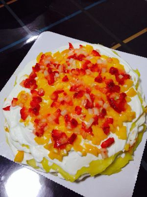 3:一层皮一层奶油一层水果一层奶油,重复,按刚才皮的量,我这里共做了六层