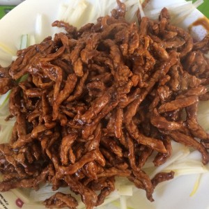 肉全部变色发白后、加入老抽,翻炒均匀。加入水淀粉、少量盐、翻炒至肉丝软糯。