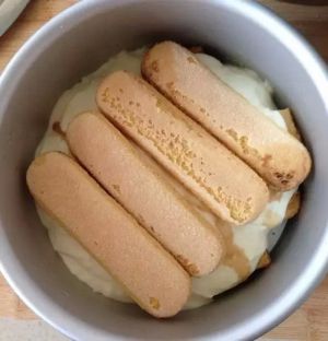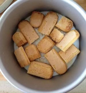 然后将蘸过咖啡酒的手指饼干铺满模具底部。