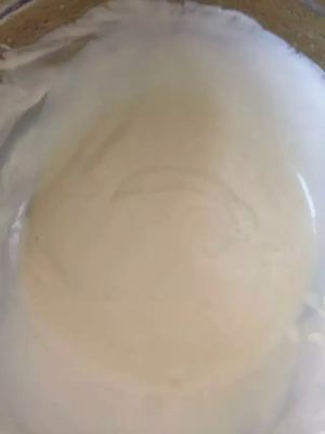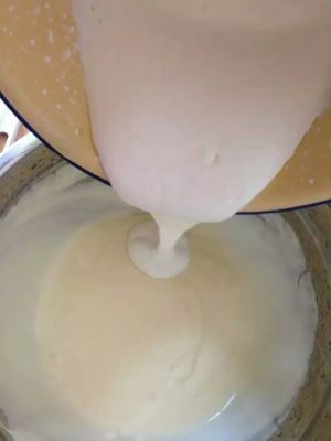 再将淡奶油倒入奶酪蛋黄糊中,将二者混合均匀。