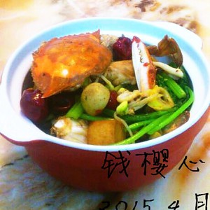 热锅凉油,先将螃蟹煎1分钟,加料酒1勺,少量开水,约5分钟。盛出。