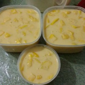 将布丁浆倒入容器,放入适量芒果肉。最后放冰箱一晚,隔天就可以开吃了。(大约放5/6小时吧)