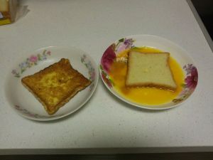 鸡蛋加适量盐打散,面包片蘸匀蛋液