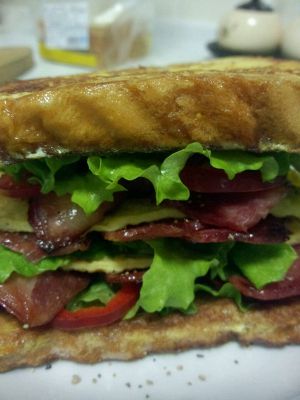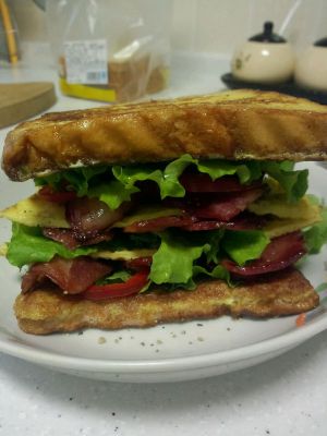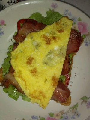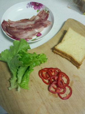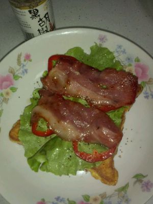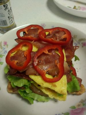 然后一层培根,一层蛋皮,一层甜椒的样子(喜欢什么尽管加吧)记得撒上胡椒碎哦
