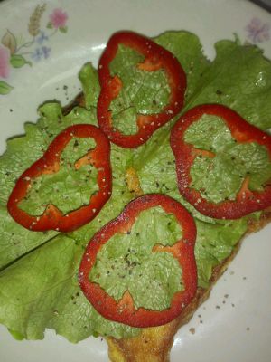 面包片上铺上生菜,甜椒,撒上胡椒碎