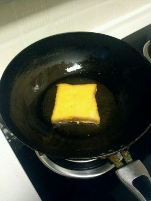 锅内少许油,两面煎黄,剩余蛋液摊成鸡蛋饼,锅内不用放油直接煎培根(一剪为二)